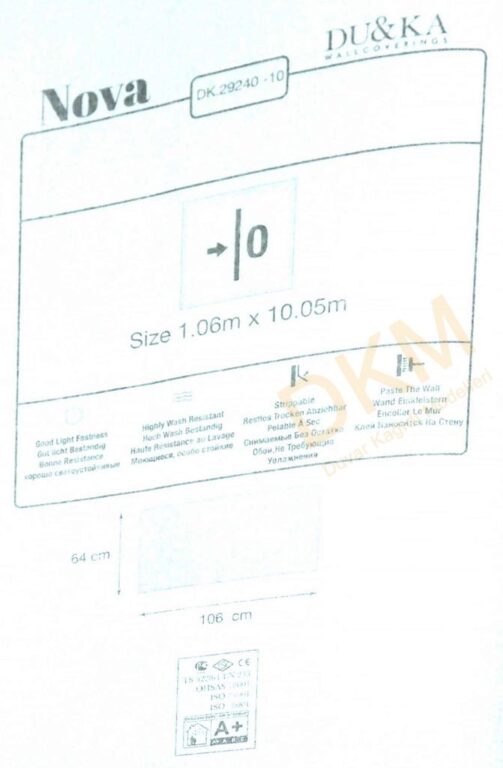 Yüzeyi Dokulu, yüzey malzemesi Vinil ve duvara yapışan taban malzemesi ise Kağıt olarak imal edilmiştir.
