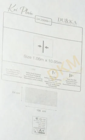Yüzeyi Dokulu, yüzey malzemesi Vinil ve duvara yapışan taban malzemesi ise Kağıt olarak imal edilmiştir.