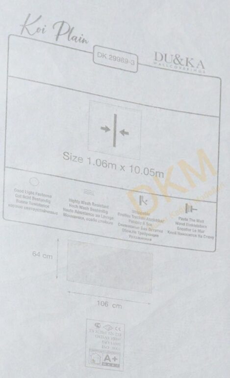 Yüzeyi Dokulu, yüzey malzemesi Vinil ve duvara yapışan taban malzemesi ise Kağıt olarak imal edilmiştir.