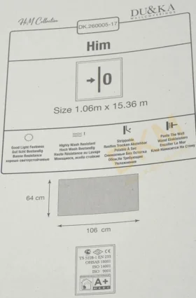 Yüzeyi Dokulu, yüzey malzemesi Vinil ve duvara yapışan taban malzemesi ise Kağıt olarak imal edilmiştir.